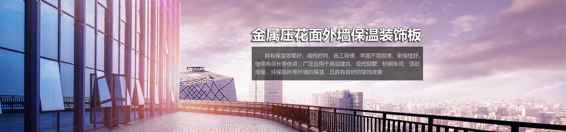 公司擁有先進(jìn)的金屬壓花面外墻保溫裝飾板電腦控制自動(dòng)生產(chǎn)線,年生產(chǎn)能力40萬平方米,可生產(chǎn)磚紋、彈涂紋、水波紋、木紋、礫石、細(xì)石、理石等多種紋樣花型、和多種色彩的產(chǎn)品,能全方位滿足中高檔寫字樓、商品住宅樓、現(xiàn)代別墅等建筑外墻保溫及裝飾的需要?!驹敿?xì)】